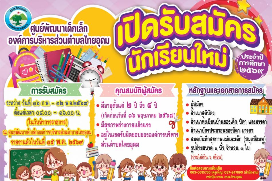 การเปิดรับสมัครนักเรียนระดับปฐมวัย ประจำปีการศึกษา 2569 ศูนย์พัฒนาเด็กเล็กองค์การบริหารส่วนตำบลไทยอุดม