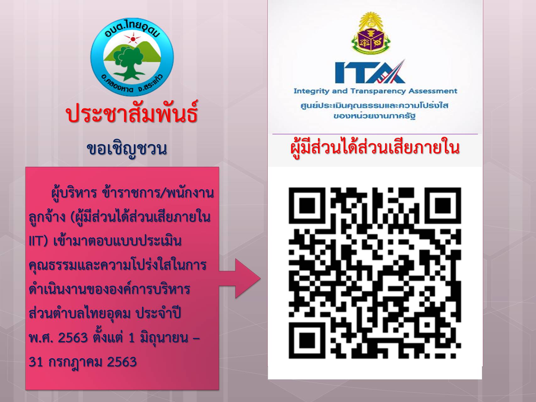 การประเมินคุณธรรมและความโปร่งใสในการดำเนินงานขององค์การบริหารส่วนตำบลไทยอุดม (ITA ประจำปี พ.ศ. 2563) [9 มิถุนายน 2563]