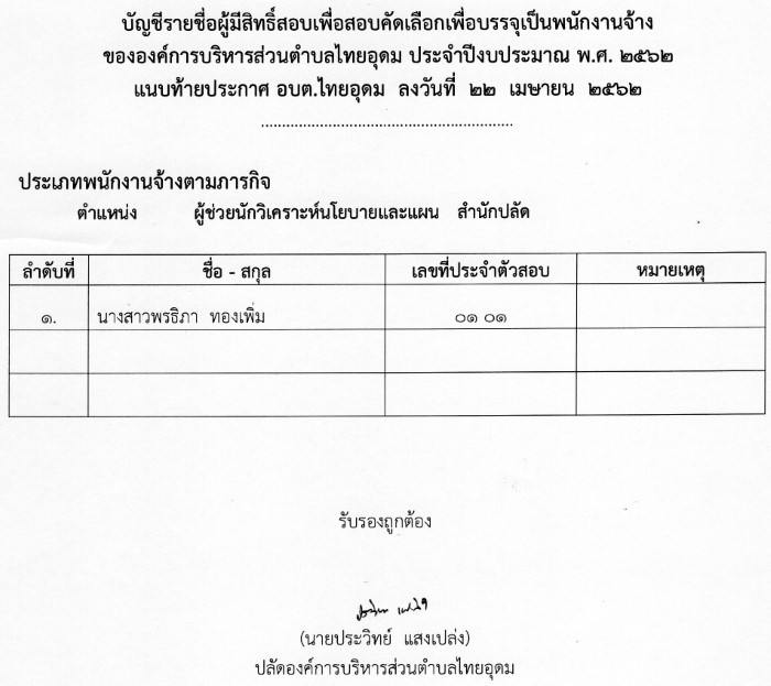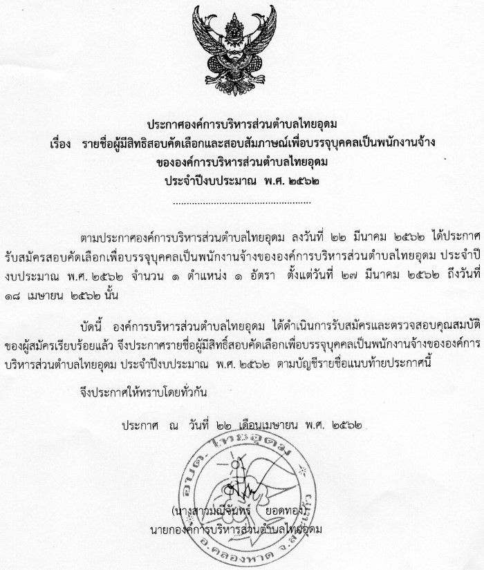 ชื่อเรื่อง : ประกาศองค์การบริหารส่วนตำบลไทยอุดม เรื่อง รายชื่อผู้มีสิทธิสอบคัดเลือกและสอบสัมภาษณ์เพื่อบรรจุบุคคลเป็นพนักงานจ้างขององค์การบริหารส่วนตำบลไทยอุดม ประจำปีงบประมาณ พ.ศ. 2562