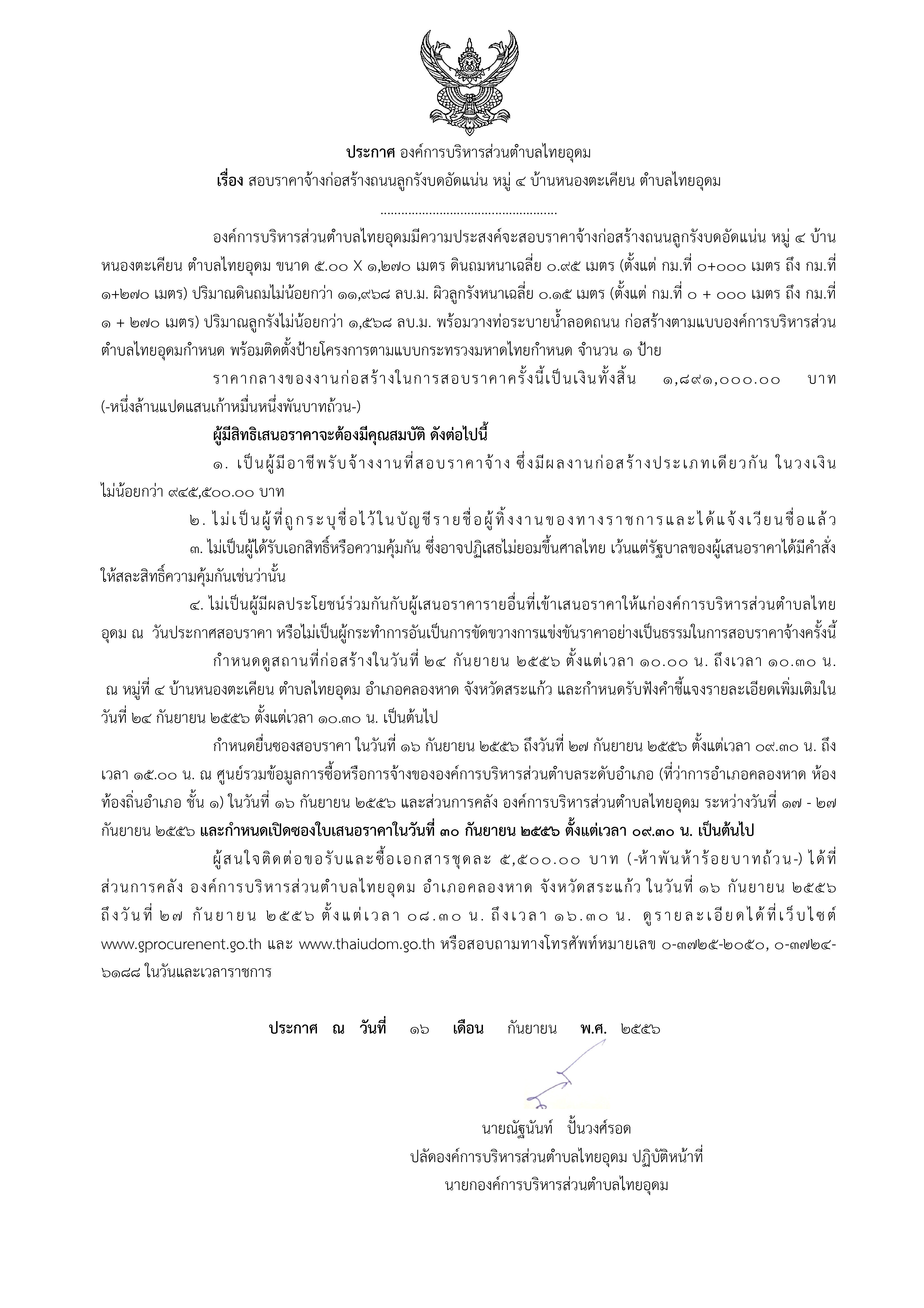 ข่าวประกาศ ประกาศสอบราคาจ้างก่อสร้างถนนลูกรังบดอัดแน่น หมู่ ๔ บ้านหนองตะเคียน ตำบลไทยอุดม