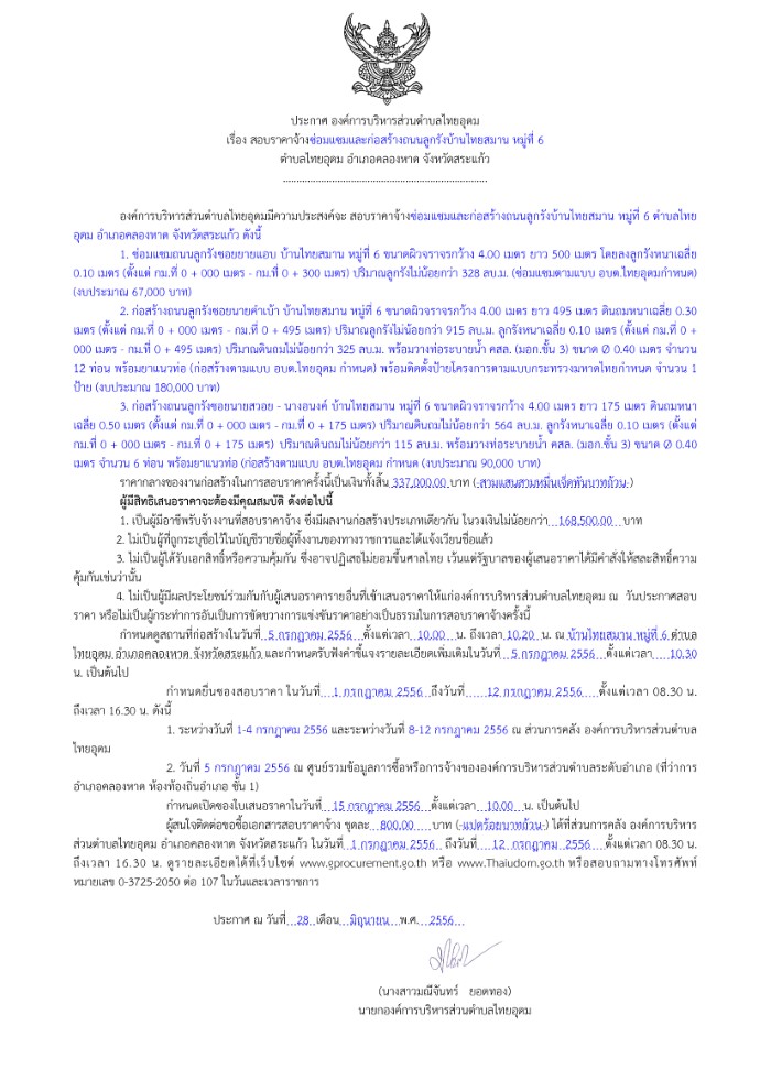 ประกาศ เรื่อง สอบราคาจ้างซ่อมแซมและก่อสร้างถนนลูกรังบ้านไทยสมาน หมู่ที่ 6