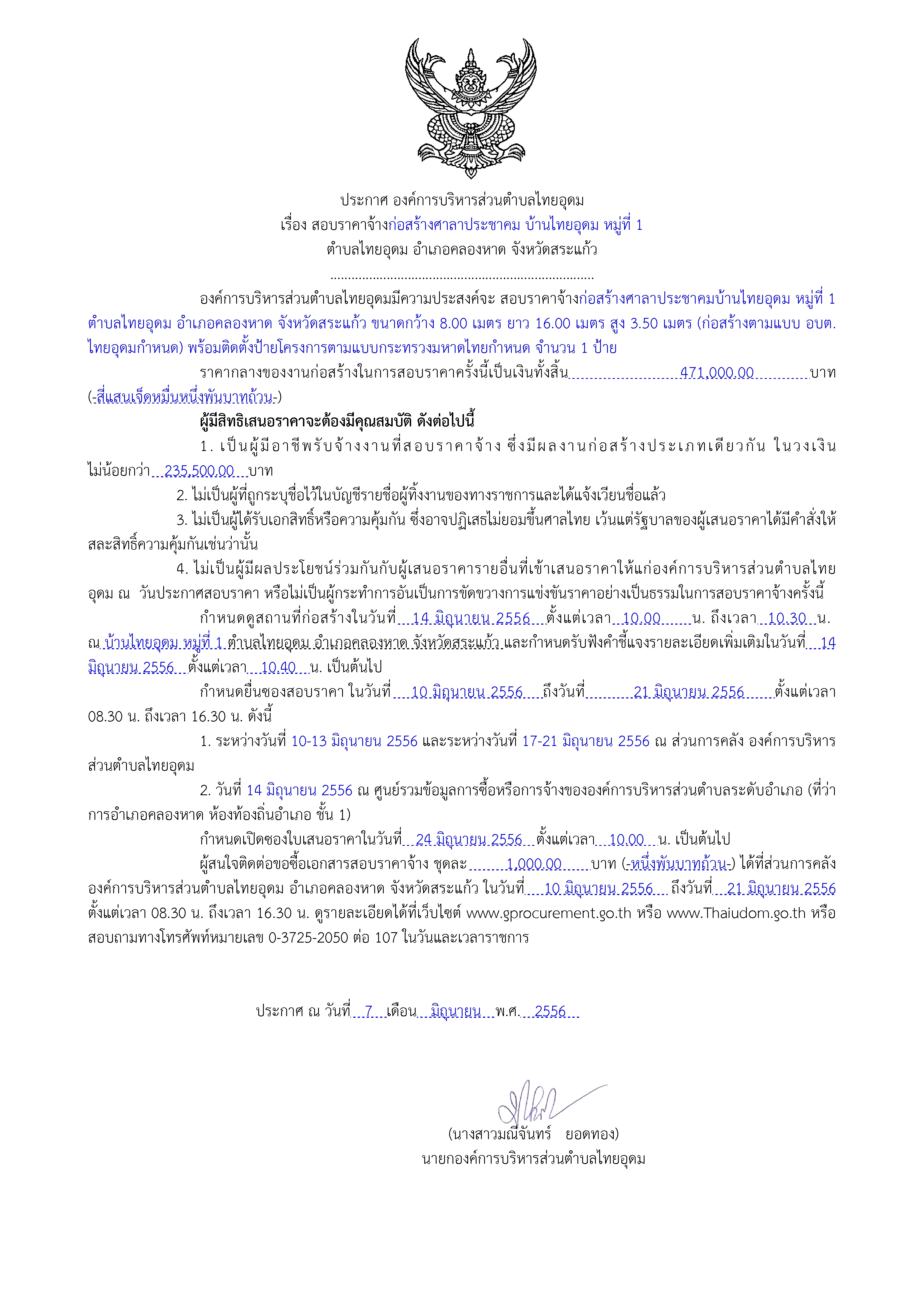 ประกาศสอบราคาจ้างก่อสร้างศาลาประชาคม บ้านไทยอุดม หมู่ที่ ๑