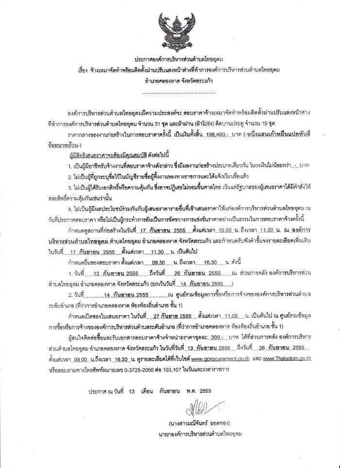 จ้างเหมาจัดทำพร้อมติดตั้งม่านปรับแสงหน้าต่างที่ทำการองค์การบริหารส่วนตำบลไทยอุดม