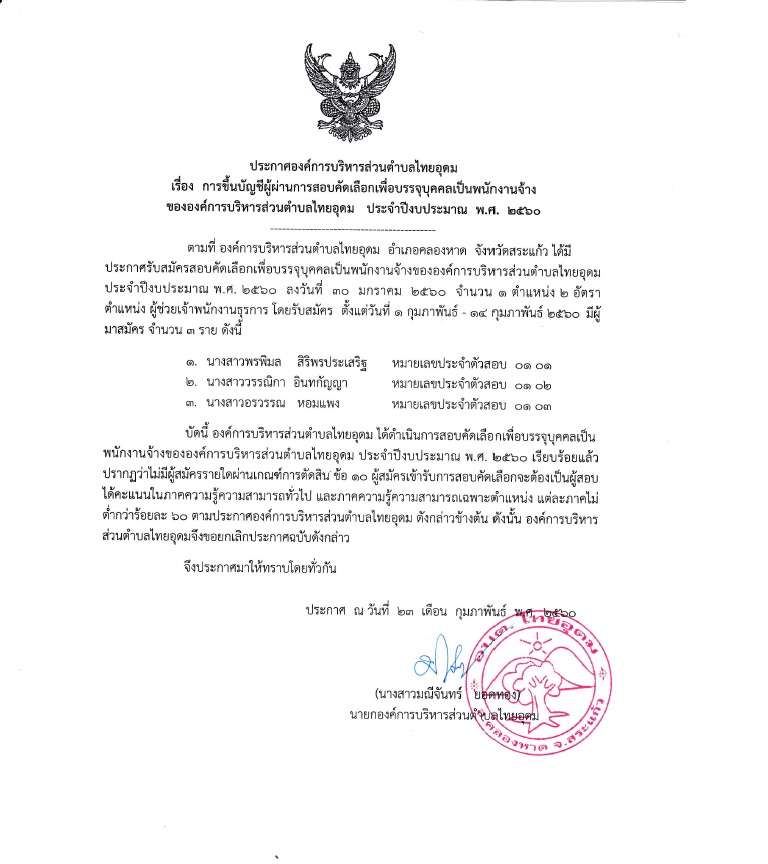 การขึ้นบัญชีผู้ผ่านการสอบคัดเลือกเพื่อบรรจุบุคคลเป็นพนักงานจ้าง ขององค์การบริหารส่วนตำบลไทยอุดม ประจำปีงบประมาณ พ.ศ. 2560