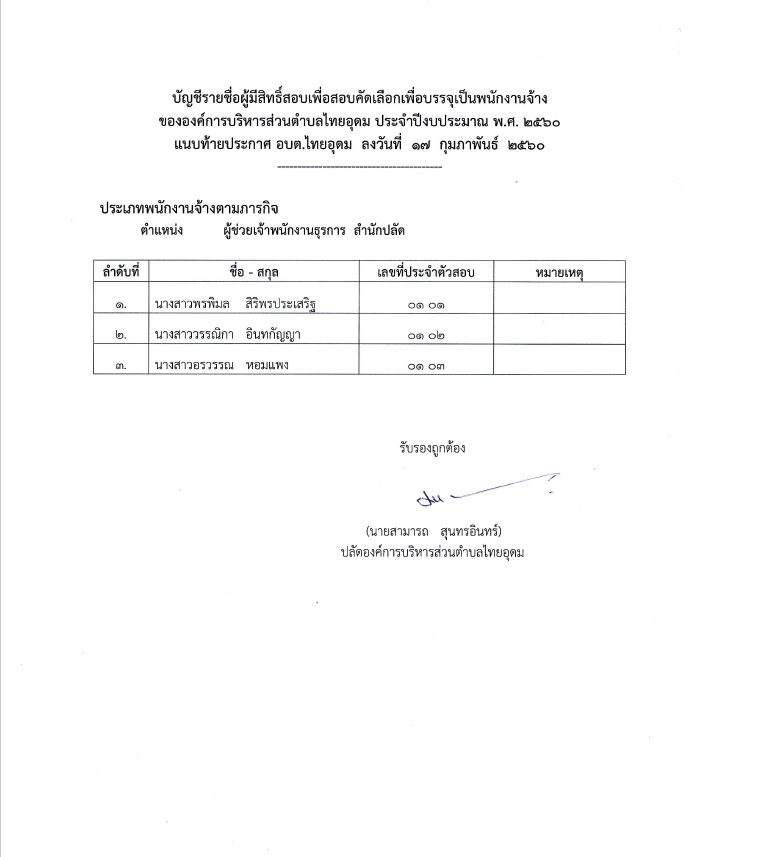 รายชื่อผู้มีสทธิ์สอบคัดเลือกและสอบสัมภาษณ์เพื่อบรรจุบุคคลเป็นพนักงานจ้าง ขององค์การบริหารส่วนตำบลไทยอุดม ประจำปีงบประมาณ พ.ศ. 2560