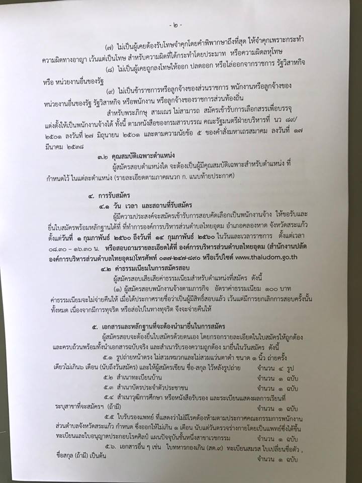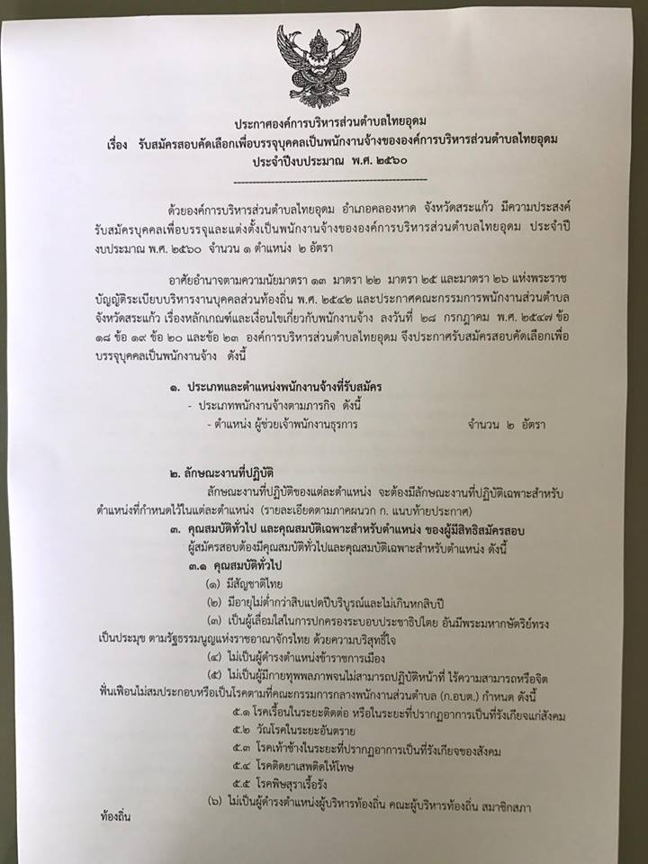 ประกาศ เรื่อง รับสมัครคัดเลือกเพื่อบรรจุบุคคลเป็นพนักงานจ้างขององค์การบริหารส่วนตำบลไทยอุดม ประจำปีงบประมาณ พ.ศ. 2560