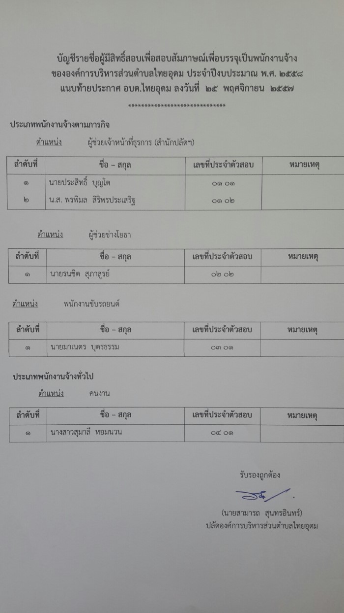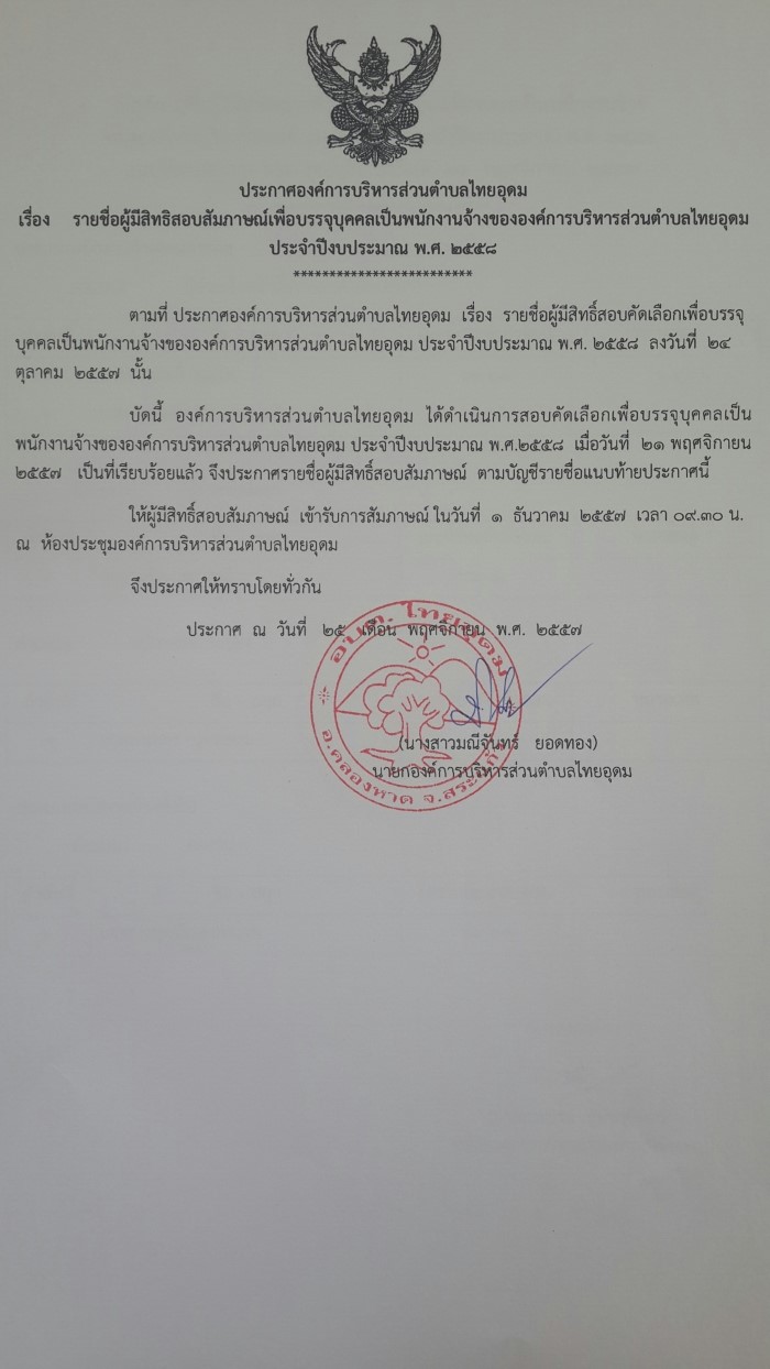 ประกาศ เรื่อง รายชื่อผู้มีสิทธิ์สอบสัมภาษณ์เพื่อบรรจุบุคคลเป็นพนักงานจ้างขององค์การบริหารส่วนตำบลไทยอุดม ประจำปีงบประมาณ พ.ศ. 2558
