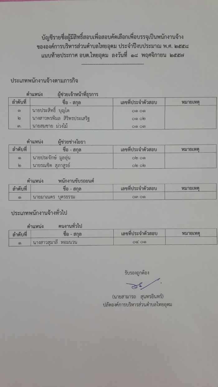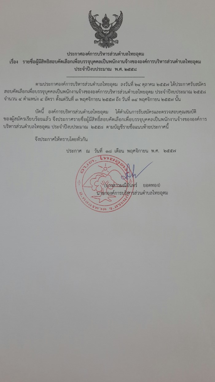 ประกาศ เรื่อง รายชื่อผู้มีสิทธิ์สอบคัดเลือกเพื่อบรรจุบุคคลเป็นพนักงานจ้างขององค์การบริหารส่วนตำบลไทยอุดม ประจำปีงบประมาณ พ.ศ. 2558