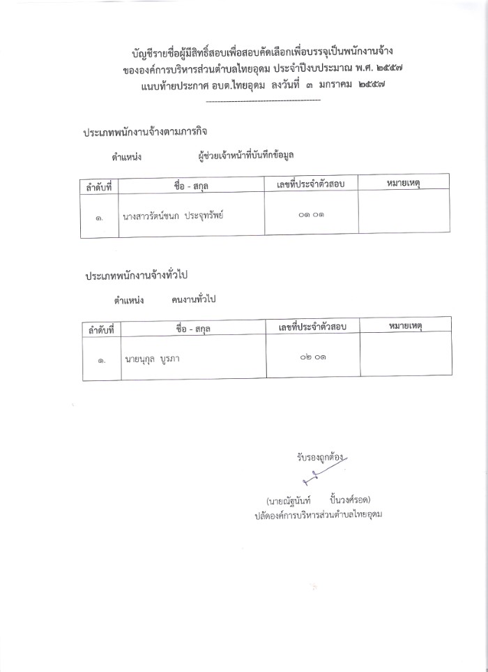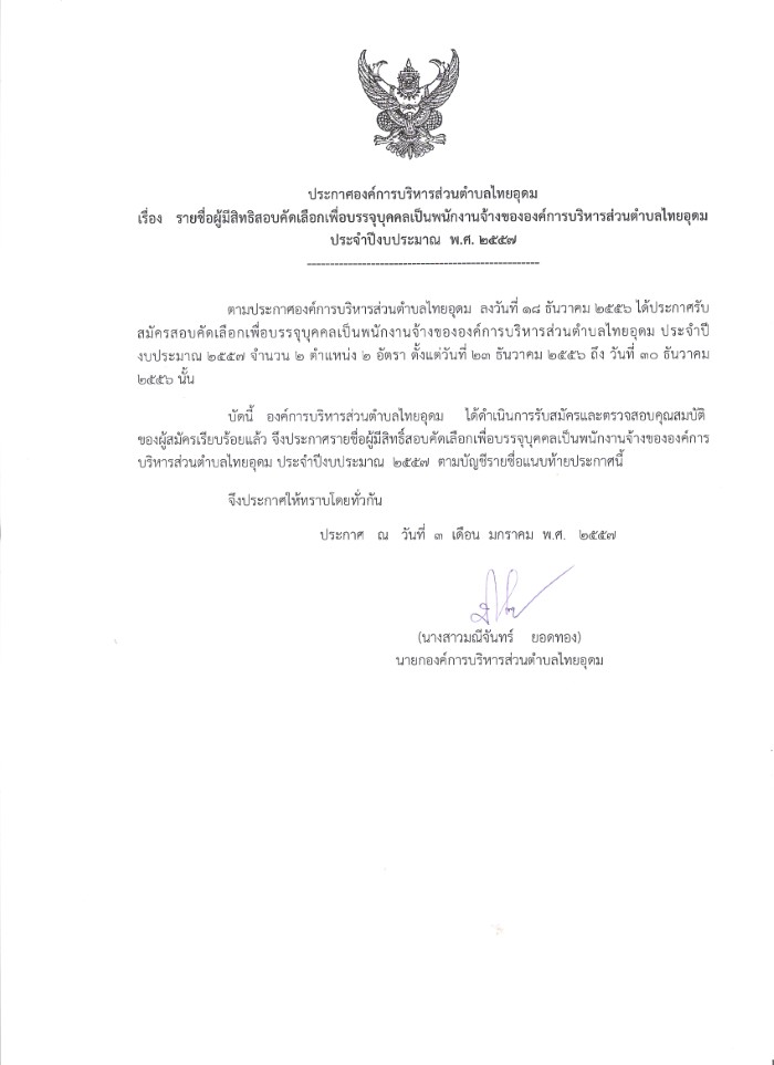 ประกาศ เรื่อง รายชื่อผู้มีสิทธิ์สอบคัดเลือกเพื่อบรรจุบุคคลเป็นพนักงานจ้างขององค์การบริหารส่วนตำบลไทยอุดม ประจำปีงบประมาณ พ.ศ. 2557