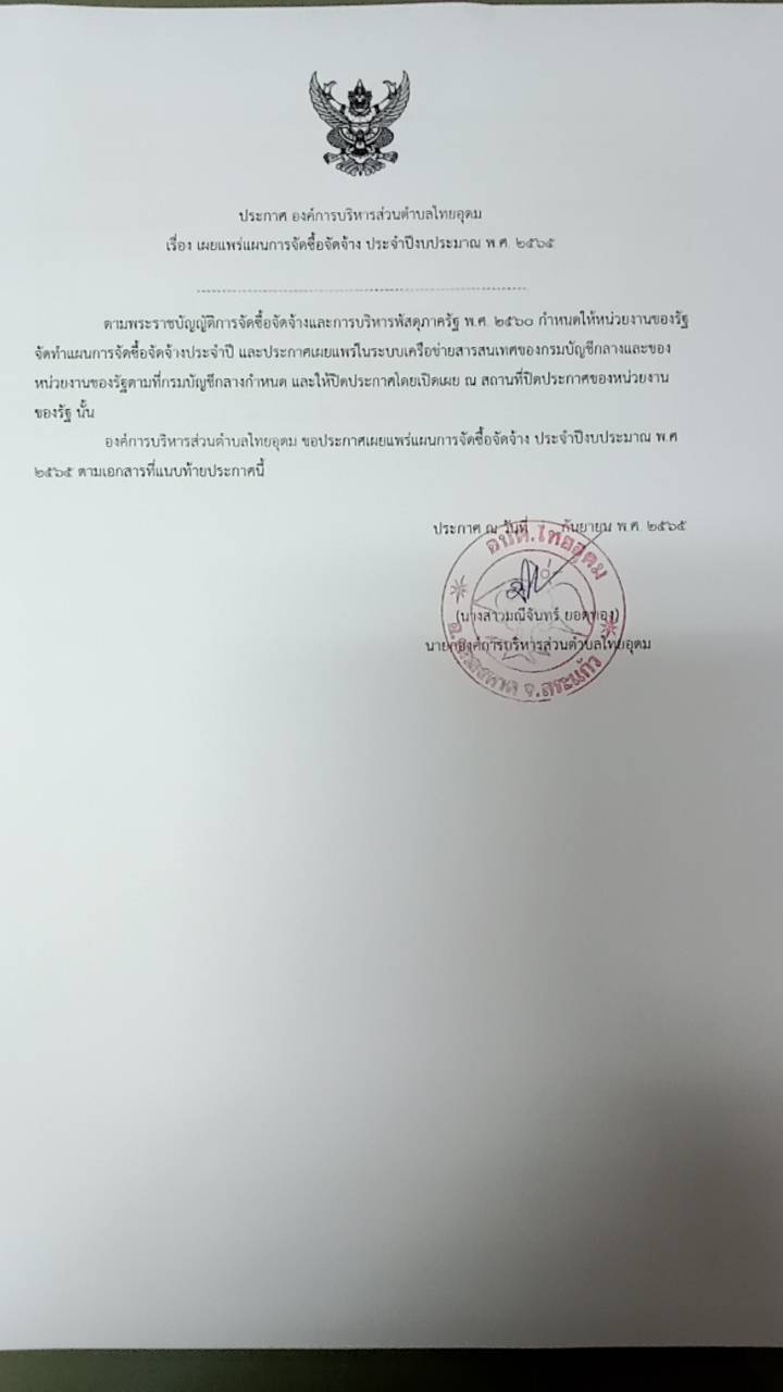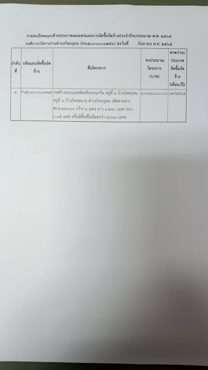 รายละเอียด : ก่อสร้างถนนแอสฟัลท์ติกคอนกรีต หมู่ที่ ๑ บ้านไทยอุดม หมู่ที่ ๖ บ้านไทยสมาน ตำบลไทยอุดม รหัสสายทาง สก.ถ.๓๙๐๐๖ กว้าง ๖ เมตร ยาว ๑,๒๘๐ เมตร หนา ๐.๐๕ เมตร หรือมีพื้นที่ไม่น้อยกว่า ๗,๖๘๐ เมตร ด้วยวิธีประกวดราคาอิเล็กทรอนิกส์ (e-bidding)