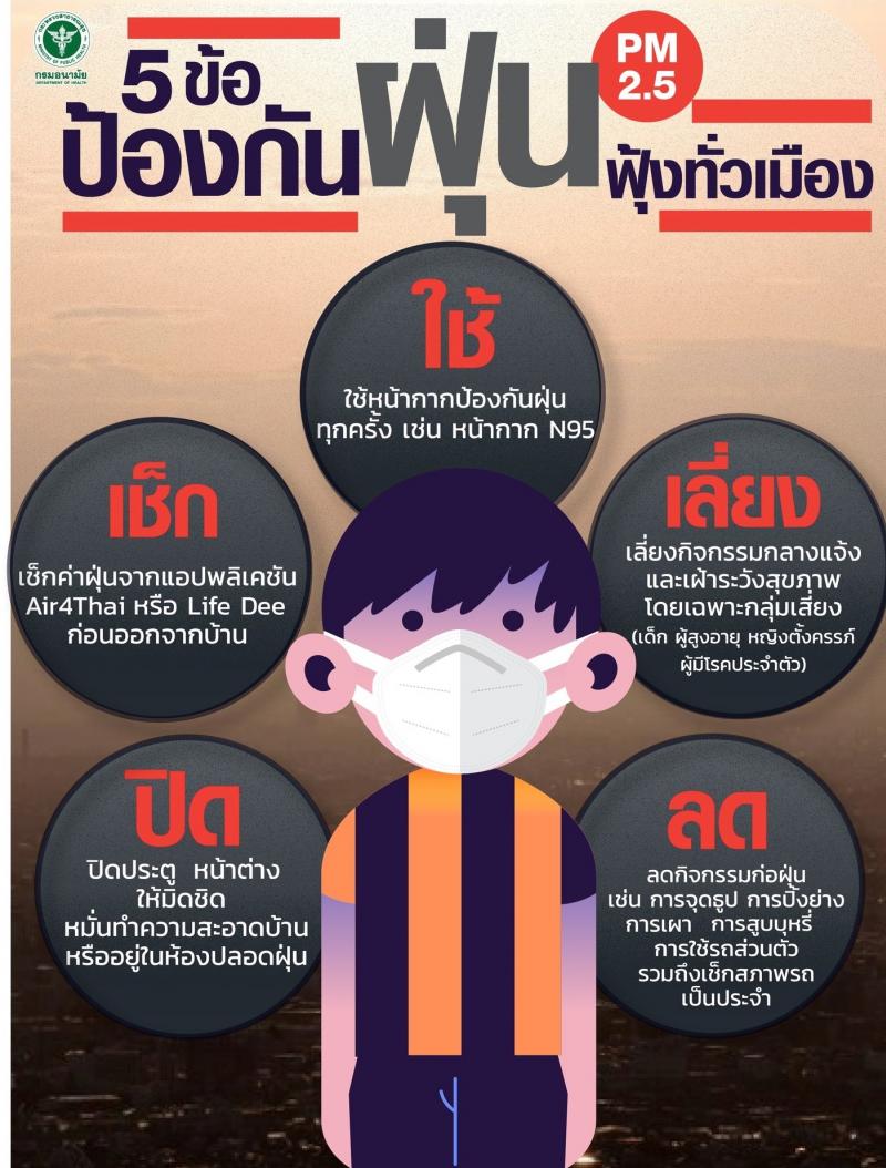 รายละเอียด : ฝุ่น PM 2.5 คืออะไร? คำว่า PM (พีเอ็ม) ย่อมาจาก Particulate Matters (พาร์ทิคิวเลทแมทเทอร์) เป็นคำเรียกค่ามาตรฐานของฝุ่นละอองขนาดเล็กที่เป็นอันตรายต่อสุขภาพ มีหน่วยวัดคือ ไมครอน หรือไมโครเมตร แบ่งเป็น 2 ชนิด ได้แก่ PM 10 และ PM 2.5 โดยฝุ่น PM 2.5 เป็นอนุภาคขนาดเล็กที่มีเส้นผ่านศูนย์กลางเฉลี่ยน้อยกว่า 2.5 ไมโครเมตร แขวนลอยอยู่ในอากาศรวมกับไอน้ำ ควัน และก๊าซต่างๆ ไม่สามารถมองเห็นได้ด้วยตาเปล่า แต่เมื่อมาอยู่รวมกันเป็นจำนวนมหาศาลจะมองเห็นเป็นหมอกควันอย่างที่เราเห็นกันในทุกๆ เช้านั่นเอง ฝุ่น PM 2.5 ถือเป็นมลพิษต่อสุขภาพของมนุษย์ตามที่องค์การอนามัยโลกให้ความสำคัญ และออกมาแจ้งเตือนให้ทราบ เพราะเป็นฝุ่นละอองที่มีขนาดเล็กมาก (เล็กกว่าเส้นผมถึง 20 เท่า) เมื่อหายใจเขาไปแล้ว สามารถเล็ดลอดผ่านขนจมูกเข้าสู่ปอดและหลอดเลือดได้ง่าย จนส่งผลเสียต่อร่างกายในระยะยาว ฝุ่นPM 2.5 มาจากไหน? สาเหตุที่ทำให้เกิดฝุ่นละออง หรือฝุ่น PM 2.5 เช่น โรงผลิตไฟฟ้า ควันท่อไอเสียจากรถยนต์ การเผาไม้ทำลายป่า เผาขยะ การเผาไหม้เชื้อเพลิงธรรมชาติที่ไม่สมบูรณ์ ฝุ่นจากการก่อสร้าง ฝุ่น PM 2.5 มีผลกระทบต่อร่างกายอย่างไร? ฝุ่น PM 2.5 ไม่มีกลิ่น มีขนาดเล็กมาก สามารถผ่านเข้าไปในร่างกายได้ถึงถุงลมปอด บางส่วนสามารถเล็ดรอดผ่านผนังถุงลมปอดเข้าไปในเส้นเลือดฝอยล่องลอยอยู่ในกระแสเลือด และกระจายตัวแทรกซึมไปทั่วร่างกายได้ ฝุ่น PM 2.5 ที่เล็ดรอดเข้าไปในร่างกายนั้น จะกระตุ้นให้เกิดสารอนุมูลอิสระ ลดระบบแอนตี้ออกซิแดนท์ รบกวนสมดุลต่างๆ ของร่างกาย และกระตุ้นยีนที่เกี่ยวข้องกับการหลั่งสารอักเสบ ซึ่งมีอันตรายต่อเนื้อเยื่อในร่างกาย และส่งผลกระทบต่างๆ ตามมา ดังนี้ กระตุ้นให้คนที่มีโรคระบบทางเดินหายใจเรื้อรังเกิดอาการกำเริบ เช่น โรคจมูกอักเสบภูมิแพ้ โรคหอบหืด และโรคถุงลมโป่งพอง กระตุ้นให้คนที่มีโรคระบบหัวใจและหลอดเลือดเรื้อรังเกิดอาการกำเริบ โดยเฉพาะโรคกล้ามเนื้อหัวใจขาดเลือด สำหรับผลระยะยาวจะทำให้การทำงานของปอดถดถอย อาจเกิดโรคถุงลมโป่งพองได้ แม้ว่าคุณจะไม่สูบบุหรี่ก็ตาม และเพิ่มโอกาสทำให้เกิดมะเร็งปอดได้อีกด้วย ข้อแนะนำและวิธีป้องกันตนเองจากฝุ่น PM 2.5 ลดการใช้ยานพาหนะส่วนตัว ส่งเสริมการใช้ระบบขนส่งสาธารณะ หลีกเลี่ยงการเผาไหม้ในที่โล่งแจ้ง เช่น การเผาพื้นที่เพื่อเตรียมการทำเกษตรกรรม การเผาขยะ หรือวัสดุเหลือใช้ เป็นต้น ควบคุมกระบวนการก่อสร้างให้มีฝุ่นน้อยที่สุด ออกกำลังกายในที่ร่ม หรือที่ที่ฝุ่นน้อย และไม่ควรใส่หน้ากากอนามัยเวลาออกกำลังกาย รับประทานอาหารที